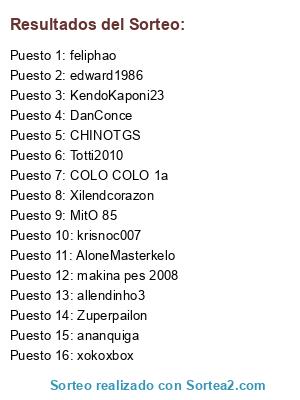 Lista de participantes: KendoKaponi23, Xilendcorazon, Totti2010, feliphao, CHINOTGS, allendinho3, makina pes 2008, xokoxbox, AloneMasterkelo, Zuperpailon, COLO COLO 1a, krisnoc007, MitO 85, DanConce, ananquiga, edward1986.
