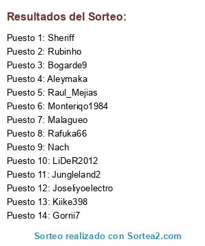 Lista de participantes: Sheriff, Aleymaka, LiDeR2012, Malagueo, Raul_Mejias, Monteriqo1984, Bogarde9, Gorrii7, Rafuka66, Rubinho, Kiike398, Nach, Jungleland2, Joseliyoelectro.