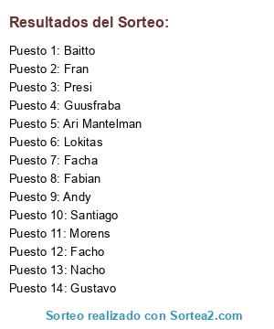 Lista de participantes: Facho, Andy, Fran, Lokitas, Gustavo, Guusfraba, Fabian, Facha, Santiago, Ari Mantelman, Nacho, Baitto, Morens, Presi.