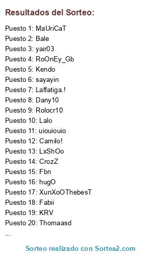 Lista de participantes: hugO, Ibra213, KRV, kezOn, Enxogb1, Thomaasd, Laffatiga.!, Rolocr10, LxShOo, maur0, XunXoOThebesT, Fbn, Nico_azul, sayayin, Sir Alex, uiouiouio, villarojinegro, RoOnEy_Gb, PX10, Wawo, Lalo, Zega, snow1, Topo, Kendo, Mati, nemesis, Bale, Camilo!, ManoW4r, JL, CrozZ, Panda, Darkoxs, JoOtA*C, Wladi, Fabii, Felipe, Albo_Angol, yair03, MaUriCaT, jFaM, oliver167, Ryusuke, Herlast, Xpektro, Dany10, Johnny.