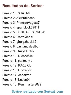 Lista de participantes: PATATAN, KA0Z CL, PrincipeVegeta7, Nicodchile, Ken masters079, Luzon04, SEBITA SPARROW, Jahalfred, patitostyle, spanblock69811, Crxzadox, GusyElLobo, bastiandalealbo, gharyxhack12, Alevibreitonn, RorroMessi.