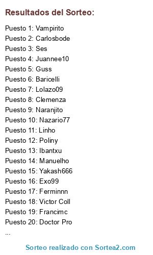Lista de participantes: Diego_Gallego, Carlosbode, Doctor Pro, Coro, Linho, Exo99, Tarracopro, Crackdown, Juannee10, Fifirichi87, Baricelli, Ibantxu, Poliny, Jae010, Nazario77, Eijolsiete7, Vampirito, Lolazo09, Atletista, Pantic, Chakal1979, Yakash666, Arbi26, Ferminnn, Clemenza, Francimc, Ses, Crackeres, Victor Coll, Manuelho, Naranjito, Guss, Torete.