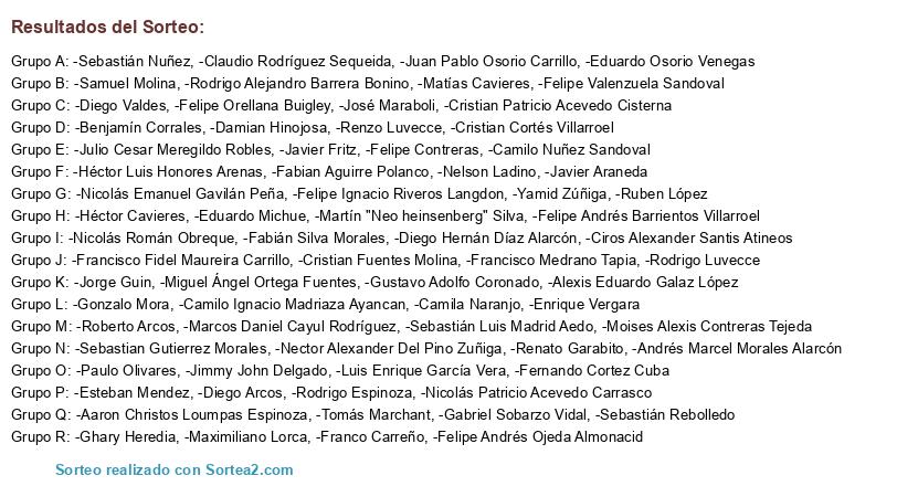 Lista de participantes: -Nicolás Emanuel Gavilán Peña, -Francisco Fidel Maureira Carrillo, -Juan Pablo Osorio Carrillo, -Cristian Fuentes Molina, -Nector Alexander Del Pino Zuñiga, -Javier Fritz, -Franco Carreño, -Gabriel Sobarzo Vidal, -Renzo Luvecce, -Ruben López, -Eduardo Michue, -Claudio Rodríguez Sequeida, -Rodrigo Luvecce, -Yamid Zúñiga, -Cristian Patricio Acevedo Cisterna, -Miguel Ángel Ortega Fuentes, -Camilo Nuñez Sandoval, -Cristian Cortés Villarroel, -Fabián Silva Morales, -Felipe Valenzuela Sandoval, -Jorge Guin, -Ghary Heredia, -Alexis Eduardo Galaz López, -Aaron Christos Loumpas Espinoza, -Héctor Luis Honores Arenas, -Ciros Alexander Santis Atineos, -José Maraboli, -Tomás Marchant, -Nicolás Patricio Acevedo Carrasco, -Felipe Andrés Barrientos Villarroel, -Fabian Aguirre Polanco, -Andrés Marcel Morales Alarcón, -Diego Valdes, -Luis Enrique García Vera, -Gonzalo Mora, -Rodrigo Alejandro Barrera Bonino, -Damian Hinojosa, -Felipe Ignacio Riveros Langdon, -Eduardo Osorio Venegas, -Sebastián Nuñez, -Camilo Ignacio Madriaza Ayancan, -Diego Hernán Díaz Alarcón, -Julio Cesar Meregildo Robles, -Maximiliano Lorca, -Felipe Andrés Ojeda Almonacid, -Sebastián Luis Madrid Aedo, -Jimmy John Delgado, -Fernando Cortez Cuba, -Moises Alexis Contreras Tejeda, -Matías Cavieres, -Héctor Cavieres, -Gustavo Adolfo Coronado, -Rodrigo Espinoza, -Sebastián Rebolledo, -Renato Garabito, -Nelson Ladino, -Samuel Molina, -Esteban Mendez, -Sebastian Gutierrez Morales, -Marcos Daniel Cayul Rodríguez, -Martín "Neo heinsenberg" Silva, -Benjamín Corrales, -Nicolás Román Obreque, -Javier Araneda, -Roberto Arcos, -Diego Arcos, -Francisco Medrano Tapia, -Enrique Vergara, -Paulo Olivares, -Camila Naranjo, -Felipe Contreras, -Felipe Orellana Buigley.