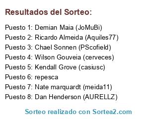 Lista de participantes: Chael Sonnen (PScofield), Dan Henderson (AURELLZ), Demian Maia (JoMuBi), Ricardo Almeida (Aquiles77), Wilson Gouveia (cerveces), Nate marquardt (meida11) , Kendall Grove (casiusc) , repesca.