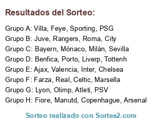 Lista de participantes: City, Copenhague, Inter, Fiore, Manutd, Juve, Roma, Milán, Arsenal, Chelsea, Bayern, Olimp, Liverp, Tottenh, Porto, Benfica, PSV, Ajax, Feye, Farza, Rangers, Lyon, Sporting, Sevilla, Mónaco, PSG, Real, Valencia, Celtic, Marsella, Villa, Atleti.