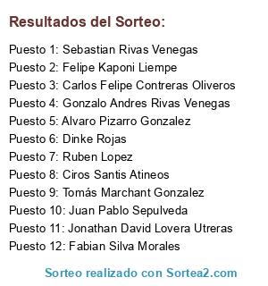 Lista de participantes: Sebastian Rivas Venegas, Ciros Santis Atineos, Fabian Silva Morales, Carlos Felipe Contreras Oliveros, Alvaro Pizarro Gonzalez, Dinke Rojas, Felipe Kaponi Liempe, Ruben Lopez, Jonathan David Lovera Utreras, Juan Pablo Sepulveda, Gonzalo Andres Rivas Venegas, Tomás Marchant Gonzalez.