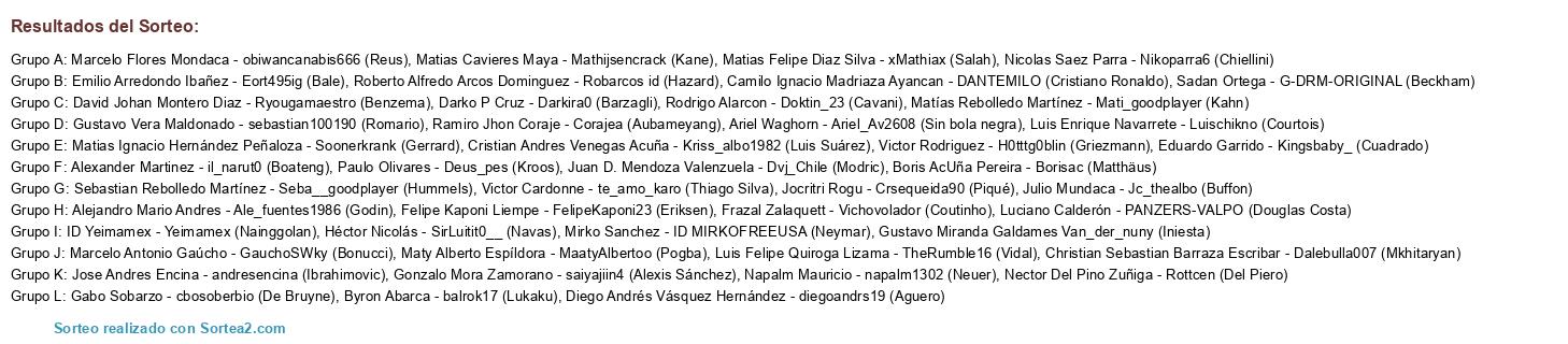 Lista de participantes: Mirko Sanchez - ID MIRKOFREEUSA (Neymar), Ramiro Jhon Coraje - Corajea (Aubameyang), Camilo Ignacio Madriaza Ayancan - DANTEMILO (Cristiano Ronaldo), Jose Andres Encina - andresencina (Ibrahimovic), Cristian Andres Venegas Acuña - Kriss_albo1982 (Luis Suárez), ID Yeimamex - Yeimamex (Nainggolan), Sadan Ortega - G-DRM-ORIGINAL (Beckham), Eduardo Garrido - Kingsbaby_ (Cuadrado), Rodrigo Alarcon - Doktin_23 (Cavani), Victor Rodriguez - H0tttg0blin (Griezmann), Frazal Zalaquett - Vichovolador (Coutinho), Julio Mundaca - Jc_thealbo (Buffon), Luis Enrique Navarrete - Luischikno (Courtois), Diego Andrés Vásquez Hernández - diegoandrs19 (Aguero), Marcelo Antonio Gaúcho - GauchoSWky (Bonucci), Jocritri Rogu - Crsequeida90 (Piqué), Emilio Arredondo Ibañez - Eort495ig (Bale), Boris AcUña Pereira - Borisac (Matthäus), Matias Cavieres Maya - Mathijsencrack (Kane), Matías Rebolledo Martínez - Mati_goodplayer (Kahn), Luciano Calderón - PANZERS-VALPO (Douglas Costa), Paulo Olivares - Deus_pes (Kroos), Victor Cardonne - te_amo_karo (Thiago Silva), Darko P Cruz - Darkira0 (Barzagli), Juan D. Mendoza Valenzuela - Dvj_Chile (Modric), Gonzalo Mora Zamorano - saiyajiin4 (Alexis Sánchez), Marcelo Flores Mondaca - obiwancanabis666 (Reus), Nector Del Pino Zuñiga - Rottcen (Del Piero), Byron Abarca - balrok17 (Lukaku), Matias Felipe Diaz Silva - xMathiax (Salah), Héctor Nicolás - SirLuitit0__ (Navas), Napalm Mauricio - napalm1302 (Neuer), Gustavo Vera Maldonado - sebastian100190 (Romario), David Johan Montero Diaz - Ryougamaestro (Benzema), Maty Alberto Espíldora - MaatyAlbertoo (Pogba), Roberto Alfredo Arcos Dominguez - Robarcos id (Hazard), Alejandro Mario Andres - Ale_fuentes1986 (Godin), Sebastian Rebolledo Martínez - Seba__goodplayer (Hummels), Alexander Martinez - il_narut0 (Boateng), Ariel Waghorn - Ariel_Av2608 (Sin bola negra), Luis Felipe Quiroga Lizama - TheRumble16 (Vidal), Gabo Sobarzo - cbosoberbio (De Bruyne), Matias Ignacio Hernández Peñaloza - Soonerkrank (Gerrard), Gustavo Miranda Galdames Van_der_nuny (Iniesta), Felipe Kaponi Liempe - FelipeKaponi23 (Eriksen), Nicolas Saez Parra - Nikoparra6 (Chiellini), Christian Sebastian Barraza Escribar - Dalebulla007 (Mkhitaryan).