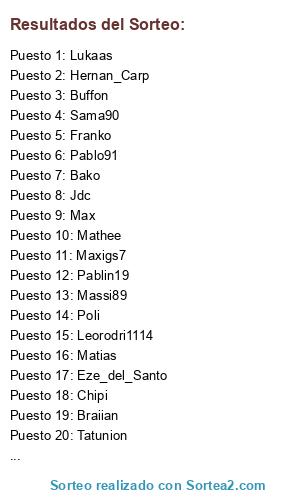 Lista de participantes: Fede, Tatunion, Mathee, xsergio92x, Sama90, Fede_1710, Pablo91, Leo91, Pablin19, Eze_del_Santo, Kity, Marco, Luis, Max, Chipi, Leorodri1114, Lukaas, Bako, Buffon, Massi89, Hernan_Carp, Matias, Poli, Maxigs7, Braiian, guti, Pilo, Jdc, Pat0, Franko, Cabe, Diego.