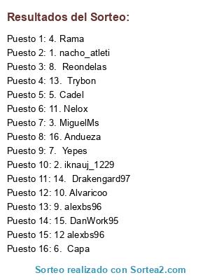 Lista de participantes: 1. nacho_atleti, 2. iknauj_1229, 3. MiguelMs, 4. Rama, 5. Cadel, 6. Capa, 7. Yepes, 8. Reondelas, 9. alexbs96, 10. Alvaricoo, 11. Nelox, 12 tamborin, 13. Trybon, 14. Drakengard97, 15. DanWork95, 16. Andueza.