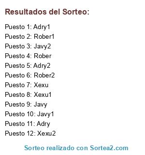 Lista de participantes: Javy, Xexu, Adry, Rober, Javy1, Xexu1, Adry1, Rober1, Javy2, Xexu2, Adry2, Rober2.