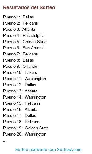 Lista de participantes: Pistons, San Antonio, Portland, San Antonio, Washington, Dallas, Dallas, Pelicans, Pelicans, Orlando, Golden State, Dallas, Portland, Dallas, Golden State, Pelicans, Philadelphia, Atlanta, Philadelphia, Orlando, Lakers, Pelicans, Atlanta, Pelicans, Golden State, Dallas, Golden State, Atlanta, Washington, Washington, Washington, Atlanta, Atlanta, Pelicans, Pelicans, Dallas, Atlanta, Pelicans, Golden State, Dallas, San Antonio, Pelicans, Atlanta, Golden State, Pelicans, Golden State, Lakers, Washington, Dallas, Orlando, Dallas, Dallas, Washington, Orlando, Utah, Pelicans, Dallas, Utah, Washington, Golden State, Washington, San Antonio, Washington, Orlando, Dallas, Utah, Dallas, San Antonio, Dallas, Atlanta, Orlando, Lakers, Atlanta, Dallas, Pelicans, Lakers, Dallas, Dallas, Pelicans, Dallas, Dallas, Atlanta, Golden State, Lakers, Philadelphia, San Antonio, Atlanta, San Antonio, Washington, Utah, San Antonio, Golden State, San Antonio, Atlanta, Golden State, Orlando, Orlando, Lakers, Golden State, Golden State, Pelicans, Atlanta, Atlanta, Pelicans, Pelicans, Atlanta, Atlanta, Atlanta, San Antonio, Dallas, San Antonio, Philadelphia, Philadelphia, Indiana, San Antonio, Orlando, Atlanta, Golden State, Atlanta, Dallas, Portland, Pelicans, San Antonio, San Antonio, Philadelphia, Golden State, Washington, Pistons, Atlanta, Washington, Washington, Philadelphia, Pelicans, Dallas, Lakers, Orlando, Pelicans, Golden State, Atlanta, Orlando, Pelicans, Atlanta, Atlanta, Dallas, Philadelphia, Atlanta, Golden State, Pelicans, Pelicans, Lakers, San Antonio, Pelicans, Golden State, Atlanta, Washington, Washington, Dallas, Dallas, Pelicans, Dallas, Washington, Washington, Dallas, Pelicans, Orlando, Orlando, Washington, Philadelphia, Atlanta, Washington, Pelicans, Atlanta, Golden State, Atlanta, Pelicans, Golden State, Pelicans, Atlanta, Pelicans, Dallas, Atlanta, Pelicans, Golden State, Pelicans, San Antonio, Washington, San Antonio, Atlanta, Washington, San Antonio, Orlando, Pelicans, Atlanta, Pelicans, Orlando, San Antonio, Atlanta, Lakers, Philadelphia, Dallas, San Antonio, San Antonio, Dallas, Pelicans, Washington, San Antonio, Golden State, Pelicans, Washington, Atlanta, Washington, San Antonio, Lakers, Washington, Golden State, Washington, Pelicans, Philadelphia, Washington, Pelicans, Washington, Utah, Golden State, Golden State, Golden State, Washington, Dallas, Indiana, San Antonio, Portland, Atlanta, Dallas, Orlando, Philadelphia, San Antonio, Dallas, Indiana, Atlanta, Philadelphia, San Antonio, San Antonio, Utah, Philadelphia, Pistons, Washington, Lakers, Golden State, Golden State, Orlando, Atlanta, Golden State, Pelicans, Dallas, Orlando, Washington, San Antonio, Atlanta, Dallas, Pelicans, Washington, Dallas, Orlando, Lakers, Washington, Atlanta, Washington, Philadelphia, Atlanta, Dallas, Dallas, Golden State, Orlando, Lakers, Washington, Pelicans, San Antonio, Dallas, Pelicans, Philadelphia, Philadelphia, San Antonio, Atlanta, Washington, Orlando, Portland, Indiana, Orlando, Dallas, San Antonio, Washington, Washington, Orlando, Lakers, Dallas, San Antonio, Atlanta, Lakers, Atlanta, Lakers, Washington, Atlanta, Washington, Golden State, Golden State, Portland, New York, Dallas, Lakers, Pelicans, Pelicans, Philadelphia, Golden State, Pelicans, San Antonio, Atlanta, Pelicans, Dallas, Orlando, Golden State, Indiana, Philadelphia, Lakers, Golden State, San Antonio, San Antonio, Washington, Pelicans, Portland, Dallas, San Antonio, Washington, Atlanta, Atlanta, Pelicans, Philadelphia, Washington, Philadelphia, Golden State, Philadelphia, Dallas, Orlando, Philadelphia, Pelicans, Pelicans, Washington, Dallas, Atlanta, Atlanta, Pelicans, Orlando, Washington, Washington, Golden State, Pelicans, Atlanta, Philadelphia, San Antonio, Golden State, New York, Washington, Lakers, Indiana, Atlanta, Orlando, Lakers, Pelicans, New York, Pelicans, Dallas, Pelicans, Pelicans, Atlanta, Dallas, Dallas, Atlanta, Dallas, Portland, Golden State, Orlando, Golden State, Golden State, Atlanta, Washington, Utah, Dallas, Atlanta, Orlando, Portland, Golden State, Dallas, San Antonio, Washington, New York, Atlanta, San Antonio, Pelicans, Atlanta, Pelicans, San Antonio, Golden State, Dallas, Dallas, Atlanta, Pelicans, Orlando, Dallas, Washington, Dallas, Golden State, Washington, Indiana, Golden State, Washington, Atlanta, Indiana, Atlanta, New York, Atlanta, San Antonio, San Antonio, Pelicans, Lakers, Washington, Dallas, Washington, Pelicans, Lakers, Pelicans, Golden State, Washington, San Antonio, Dallas, Pelicans, Pelicans, Portland, Golden State, Philadelphia, Orlando, San Antonio, Washington, Golden State, Golden State, Washington, Atlanta, Atlanta, Philadelphia, Golden State, Lakers, Atlanta, Dallas, Indiana, Dallas, San Antonio, Pelicans, Washington, Orlando, Golden State, Washington, Dallas, Lakers, Dallas, Dallas, Golden State, Dallas, Pelicans, Portland, Orlando, Pelicans, Pelicans, San Antonio, Lakers, San Antonio, Washington, Washington, Lakers, Atlanta, Golden State, Pelicans, Dallas, Pelicans, Washington, Golden State, Pelicans, San Antonio, Indiana, Dallas, Dallas, Indiana, Indiana, San Antonio, Utah, San Antonio, Dallas, Golden State, Philadelphia, Philadelphia, Orlando, Dallas, Atlanta, Dallas, Dallas, Orlando, Washington, Pelicans, Pelicans, Atlanta, Pelicans, Washington, Pelicans, Pelicans, Dallas, San Antonio, Washington, Golden State, Golden State, Atlanta, Dallas, Portland, Atlanta, Atlanta, Atlanta, Washington, Portland, Philadelphia, San Antonio, Golden State, Dallas, Pelicans, Washington, Dallas, Dallas, Golden State, Golden State, San Antonio, San Antonio, Pelicans, Atlanta, Pelicans, Atlanta, Washington, Pelicans, Atlanta, Pelicans, Golden State, Golden State, Atlanta, San Antonio, New York, Washington, Atlanta, Indiana, Philadelphia, Dallas, Pelicans, Pelicans, Dallas, Dallas, Orlando, San Antonio, Atlanta, Dallas, Dallas, Dallas, Washington, Golden State, Golden State, Dallas, O