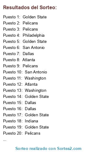 Lista de participantes: Pistons, San Antonio, Portland, San Antonio, Washington, Dallas, Dallas, Pelicans, Pelicans, Orlando, Golden State, Dallas, Portland, Dallas, Golden State, Pelicans, Philadelphia, Atlanta, Philadelphia, Orlando, Lakers, Pelicans, Atlanta, Pelicans, Golden State, Dallas, Golden State, Atlanta, Washington, Washington, Washington, Atlanta, Atlanta, Pelicans, Pelicans, Dallas, Atlanta, Pelicans, Golden State, Dallas, San Antonio, Pelicans, Atlanta, Golden State, Pelicans, Golden State, Lakers, Washington, Dallas, Orlando, Dallas, Dallas, Washington, Orlando, Utah, Pelicans, Dallas, Utah, Washington, Golden State, Washington, San Antonio, Washington, Orlando, Dallas, Utah, Dallas, San Antonio, Dallas, Atlanta, Orlando, Lakers, Atlanta, Dallas, Pelicans, Lakers, Dallas, Dallas, Pelicans, Dallas, Dallas, Atlanta, Golden State, Lakers, Philadelphia, San Antonio, Atlanta, San Antonio, Washington, Utah, San Antonio, Golden State, San Antonio, Atlanta, Golden State, Orlando, Orlando, Lakers, Golden State, Golden State, Pelicans, Atlanta, Atlanta, Pelicans, Pelicans, Atlanta, Atlanta, Atlanta, San Antonio, Dallas, San Antonio, Philadelphia, Philadelphia, Indiana, San Antonio, Orlando, Atlanta, Golden State, Atlanta, Dallas, Portland, Pelicans, San Antonio, San Antonio, Philadelphia, Golden State, Washington, Pistons, Atlanta, Washington, Washington, Philadelphia, Pelicans, Dallas, Lakers, Orlando, Pelicans, Golden State, Atlanta, Orlando, Pelicans, Atlanta, Atlanta, Dallas, Philadelphia, Atlanta, Golden State, Pelicans, Pelicans, Lakers, San Antonio, Pelicans, Golden State, Atlanta, Washington, Washington, Dallas, Dallas, Pelicans, Dallas, Washington, Washington, Dallas, Pelicans, Orlando, Orlando, Washington, Philadelphia, Atlanta, Washington, Pelicans, Atlanta, Golden State, Atlanta, Pelicans, Golden State, Pelicans, Atlanta, Pelicans, Dallas, Atlanta, Pelicans, Golden State, Pelicans, San Antonio, Washington, San Antonio, Atlanta, Washington, San Antonio, Orlando, Pelicans, Atlanta, Pelicans, Orlando, San Antonio, Atlanta, Lakers, Philadelphia, Dallas, San Antonio, San Antonio, Dallas, Pelicans, Washington, San Antonio, Golden State, Pelicans, Washington, Atlanta, Washington, San Antonio, Lakers, Washington, Golden State, Washington, Pelicans, Philadelphia, Washington, Pelicans, Washington, Utah, Golden State, Golden State, Golden State, Washington, Dallas, Indiana, San Antonio, Portland, Atlanta, Dallas, Orlando, Philadelphia, San Antonio, Dallas, Indiana, Atlanta, Philadelphia, San Antonio, San Antonio, Utah, Philadelphia, Pistons, Washington, Lakers, Golden State, Golden State, Orlando, Atlanta, Golden State, Pelicans, Dallas, Orlando, Washington, San Antonio, Atlanta, Dallas, Pelicans, Washington, Dallas, Orlando, Lakers, Washington, Atlanta, Washington, Philadelphia, Atlanta, Dallas, Dallas, Golden State, Orlando, Lakers, Washington, Pelicans, San Antonio, Dallas, Pelicans, Philadelphia, Philadelphia, San Antonio, Atlanta, Washington, Orlando, Portland, Indiana, Orlando, Dallas, San Antonio, Washington, Washington, Orlando, Lakers, Dallas, San Antonio, Atlanta, Lakers, Atlanta, Lakers, Washington, Atlanta, Washington, Golden State, Golden State, Portland, New York, Dallas, Lakers, Pelicans, Pelicans, Philadelphia, Golden State, Pelicans, San Antonio, Atlanta, Pelicans, Dallas, Orlando, Golden State, Indiana, Philadelphia, Lakers, Golden State, San Antonio, San Antonio, Washington, Pelicans, Portland, Dallas, San Antonio, Washington, Atlanta, Atlanta, Pelicans, Philadelphia, Washington, Philadelphia, Golden State, Philadelphia, Dallas, Orlando, Philadelphia, Pelicans, Pelicans, Washington, Dallas, Atlanta, Atlanta, Pelicans, Orlando, Washington, Washington, Golden State, Pelicans, Atlanta, Philadelphia, San Antonio, Golden State, New York, Washington, Lakers, Indiana, Atlanta, Orlando, Lakers, Pelicans, New York, Pelicans, Dallas, Pelicans, Pelicans, Atlanta, Dallas, Dallas, Atlanta, Dallas, Portland, Golden State, Orlando, Golden State, Golden State, Atlanta, Washington, Utah, Dallas, Atlanta, Orlando, Portland, Golden State, Dallas, San Antonio, Washington, New York, Atlanta, San Antonio, Pelicans, Atlanta, Pelicans, San Antonio, Golden State, Dallas, Dallas, Atlanta, Pelicans, Orlando, Dallas, Washington, Dallas, Golden State, Washington, Indiana, Golden State, Washington, Atlanta, Indiana, Atlanta, New York, Atlanta, San Antonio, San Antonio, Pelicans, Lakers, Washington, Dallas, Washington, Pelicans, Lakers, Pelicans, Golden State, Washington, San Antonio, Dallas, Pelicans, Pelicans, Portland, Golden State, Philadelphia, Orlando, San Antonio, Washington, Golden State, Golden State, Washington, Atlanta, Atlanta, Philadelphia, Golden State, Lakers, Atlanta, Dallas, Indiana, Dallas, San Antonio, Pelicans, Washington, Orlando, Golden State, Washington, Dallas, Lakers, Dallas, Dallas, Golden State, Dallas, Pelicans, Portland, Orlando, Pelicans, Pelicans, San Antonio, Lakers, San Antonio, Washington, Washington, Lakers, Atlanta, Golden State, Pelicans, Dallas, Pelicans, Washington, Golden State, Pelicans, San Antonio, Indiana, Dallas, Dallas, Indiana, Indiana, San Antonio, Utah, San Antonio, Dallas, Golden State, Philadelphia, Philadelphia, Orlando, Dallas, Atlanta, Dallas, Dallas, Orlando, Washington, Pelicans, Pelicans, Atlanta, Pelicans, Washington, Pelicans, Pelicans, Dallas, San Antonio, Washington, Golden State, Golden State, Atlanta, Dallas, Portland, Atlanta, Atlanta, Atlanta, Washington, Portland, Philadelphia, San Antonio, Golden State, Dallas, Pelicans, Washington, Dallas, Dallas, Golden State, Golden State, San Antonio, San Antonio, Pelicans, Atlanta, Pelicans, Atlanta, Washington, Pelicans, Atlanta, Pelicans, Golden State, Golden State, Atlanta, San Antonio, New York, Washington, Atlanta, Indiana, Philadelphia, Dallas, Pelicans, Pelicans, Dallas, Dallas, Orlando, San Antonio, Atlanta, Dallas, Dallas, Dallas, Washington, Golden State, Golden State, Dallas, O