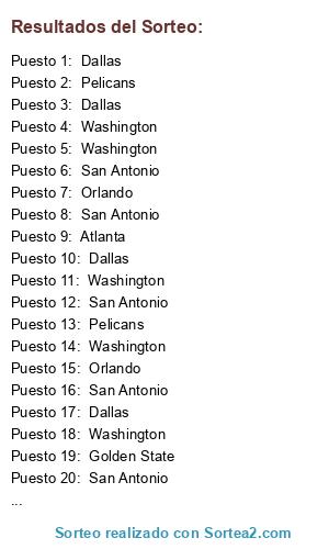 Lista de participantes: Pistons, San Antonio, Portland, San Antonio, Washington, Dallas, Dallas, Pelicans, Pelicans, Orlando, Golden State, Dallas, Portland, Dallas, Golden State, Pelicans, Philadelphia, Atlanta, Philadelphia, Orlando, Lakers, Pelicans, Atlanta, Pelicans, Golden State, Dallas, Golden State, Atlanta, Washington, Washington, Washington, Atlanta, Atlanta, Pelicans, Pelicans, Dallas, Atlanta, Pelicans, Golden State, Dallas, San Antonio, Pelicans, Atlanta, Golden State, Pelicans, Golden State, Lakers, Washington, Dallas, Orlando, Dallas, Dallas, Washington, Orlando, Utah, Pelicans, Dallas, Utah, Washington, Golden State, Washington, San Antonio, Washington, Orlando, Dallas, Utah, Dallas, San Antonio, Dallas, Atlanta, Orlando, Lakers, Atlanta, Dallas, Pelicans, Lakers, Dallas, Dallas, Pelicans, Dallas, Dallas, Atlanta, Golden State, Lakers, Philadelphia, San Antonio, Atlanta, San Antonio, Washington, Utah, San Antonio, Golden State, San Antonio, Atlanta, Golden State, Orlando, Orlando, Lakers, Golden State, Golden State, Pelicans, Atlanta, Atlanta, Pelicans, Pelicans, Atlanta, Atlanta, Atlanta, San Antonio, Dallas, San Antonio, Philadelphia, Philadelphia, Indiana, San Antonio, Orlando, Atlanta, Golden State, Atlanta, Dallas, Portland, Pelicans, San Antonio, San Antonio, Philadelphia, Golden State, Washington, Pistons, Atlanta, Washington, Washington, Philadelphia, Pelicans, Dallas, Lakers, Orlando, Pelicans, Golden State, Atlanta, Orlando, Pelicans, Atlanta, Atlanta, Dallas, Philadelphia, Atlanta, Golden State, Pelicans, Pelicans, Lakers, San Antonio, Pelicans, Golden State, Atlanta, Washington, Washington, Dallas, Dallas, Pelicans, Dallas, Washington, Washington, Dallas, Pelicans, Orlando, Orlando, Washington, Philadelphia, Atlanta, Washington, Pelicans, Atlanta, Golden State, Atlanta, Pelicans, Golden State, Pelicans, Atlanta, Pelicans, Dallas, Atlanta, Pelicans, Golden State, Pelicans, San Antonio, Washington, San Antonio, Atlanta, Washington, San Antonio, Orlando, Pelicans, Atlanta, Pelicans, Orlando, San Antonio, Atlanta, Lakers, Philadelphia, Dallas, San Antonio, San Antonio, Dallas, Pelicans, Washington, San Antonio, Golden State, Pelicans, Washington, Atlanta, Washington, San Antonio, Lakers, Washington, Golden State, Washington, Pelicans, Philadelphia, Washington, Pelicans, Washington, Utah, Golden State, Golden State, Golden State, Washington, Dallas, Indiana, San Antonio, Portland, Atlanta, Dallas, Orlando, Philadelphia, San Antonio, Dallas, Indiana, Atlanta, Philadelphia, San Antonio, San Antonio, Utah, Philadelphia, Pistons, Washington, Lakers, Golden State, Golden State, Orlando, Atlanta, Golden State, Pelicans, Dallas, Orlando, Washington, San Antonio, Atlanta, Dallas, Pelicans, Washington, Dallas, Orlando, Lakers, Washington, Atlanta, Washington, Philadelphia, Atlanta, Dallas, Dallas, Golden State, Orlando, Lakers, Washington, Pelicans, San Antonio, Dallas, Pelicans, Philadelphia, Philadelphia, San Antonio, Atlanta, Washington, Orlando, Portland, Indiana, Orlando, Dallas, San Antonio, Washington, Washington, Orlando, Lakers, Dallas, San Antonio, Atlanta, Lakers, Atlanta, Lakers, Washington, Atlanta, Washington, Golden State, Golden State, Portland, New York, Dallas, Lakers, Pelicans, Pelicans, Philadelphia, Golden State, Pelicans, San Antonio, Atlanta, Pelicans, Dallas, Orlando, Golden State, Indiana, Philadelphia, Lakers, Golden State, San Antonio, San Antonio, Washington, Pelicans, Portland, Dallas, San Antonio, Washington, Atlanta, Atlanta, Pelicans, Philadelphia, Washington, Philadelphia, Golden State, Philadelphia, Dallas, Orlando, Philadelphia, Pelicans, Pelicans, Washington, Dallas, Atlanta, Atlanta, Pelicans, Orlando, Washington, Washington, Golden State, Pelicans, Atlanta, Philadelphia, San Antonio, Golden State, New York, Washington, Lakers, Indiana, Atlanta, Orlando, Lakers, Pelicans, New York, Pelicans, Dallas, Pelicans, Pelicans, Atlanta, Dallas, Dallas, Atlanta, Dallas, Portland, Golden State, Orlando, Golden State, Golden State, Atlanta, Washington, Utah, Dallas, Atlanta, Orlando, Portland, Golden State, Dallas, San Antonio, Washington, New York, Atlanta, San Antonio, Pelicans, Atlanta, Pelicans, San Antonio, Golden State, Dallas, Dallas, Atlanta, Pelicans, Orlando, Dallas, Washington, Dallas, Golden State, Washington, Indiana, Golden State, Washington, Atlanta, Indiana, Atlanta, New York, Atlanta, San Antonio, San Antonio, Pelicans, Lakers, Washington, Dallas, Washington, Pelicans, Lakers, Pelicans, Golden State, Washington, San Antonio, Dallas, Pelicans, Pelicans, Portland, Golden State, Philadelphia, Orlando, San Antonio, Washington, Golden State, Golden State, Washington, Atlanta, Atlanta, Philadelphia, Golden State, Lakers, Atlanta, Dallas, Indiana, Dallas, San Antonio, Pelicans, Washington, Orlando, Golden State, Washington, Dallas, Lakers, Dallas, Dallas, Golden State, Dallas, Pelicans, Portland, Orlando, Pelicans, Pelicans, San Antonio, Lakers, San Antonio, Washington, Washington, Lakers, Atlanta, Golden State, Pelicans, Dallas, Pelicans, Washington, Golden State, Pelicans, San Antonio, Indiana, Dallas, Dallas, Indiana, Indiana, San Antonio, Utah, San Antonio, Dallas, Golden State, Philadelphia, Philadelphia, Orlando, Dallas, Atlanta, Dallas, Dallas, Orlando, Washington, Pelicans, Pelicans, Atlanta, Pelicans, Washington, Pelicans, Pelicans, Dallas, San Antonio, Washington, Golden State, Golden State, Atlanta, Dallas, Portland, Atlanta, Atlanta, Atlanta, Washington, Portland, Philadelphia, San Antonio, Golden State, Dallas, Pelicans, Washington, Dallas, Dallas, Golden State, Golden State, San Antonio, San Antonio, Pelicans, Atlanta, Pelicans, Atlanta, Washington, Pelicans, Atlanta, Pelicans, Golden State, Golden State, Atlanta, San Antonio, New York, Washington, Atlanta, Indiana, Philadelphia, Dallas, Pelicans, Pelicans, Dallas, Dallas, Orlando, San Antonio, Atlanta, Dallas, Dallas, Dallas, Washington, Golden State, Golden State, Dallas, O