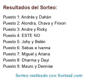 Lista de participantes: Andrés y Dahán, Mauro y Dennise, Sebas e Ivanna, Dharma y Dayi, Alondra, Chava y Frixon, Miguel y Ariana, Andre y Ricky, Johy y Belén, ESTE NO.
