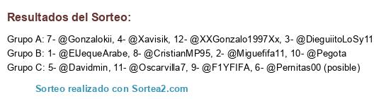 Lista de participantes: 1- @ElJequeArabe, 2- @Miguefifa11, 3- @DieguiitoLoSy11, 4- @Xavisik, 5- @Davidmin, 6- @Pernitas00 (posible), 7- @Gonzalokii, 8- @CristianMP95, 9- @F1YFIFA, 10- @Pegota, 11- @Oscarvilla7, 12- @XXGonzalo1997Xx.