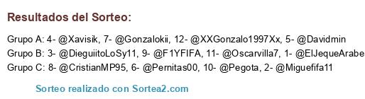 Lista de participantes: 1- @ElJequeArabe, 2- @Miguefifa11, 3- @DieguiitoLoSy11, 4- @Xavisik, 5- @Davidmin, 6- @Pernitas00, 7- @Gonzalokii, 8- @CristianMP95, 9- @F1YFIFA, 10- @Pegota, 11- @Oscarvilla7, 12- @XXGonzalo1997Xx.