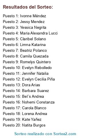 Lista de participantes: Nohemi Constanza, Camila Quezada, Carola Blanco, Evelyn Cecilia Piña, Bel´s Andrea, Jessy Mendez, Beatriz Polanco, Barbara Suarez, Yessica Negrita, Dora Arias, Kate Yañez, Limna Katarina, Romelys Quintero, Maria Alexandra Lucci, Lorena Andrea, Claribel Solano, Jennifer Natalia, Natita Burgos, Evelyn Rebolledo, Ivonne Méndez.
