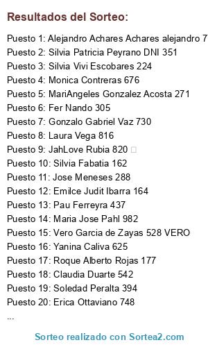 Lista de participantes: Emilce Judit Ibarra 164, Martin Garcia 064, Mancini Fakolin Facundo 233, Maria Jose Pahl 982, Claudia Duarte 542, Hugo Nob 945, Vero Newells 166, Juan Tychio Rodriguez 930, Joel Zapata 068, Romi Paolini 186, Yanina Caliva 625, Natalia Videla 454, Andy RA de Sanz 322, Mari Maiela 379, Maria Jose Dallera 356, Monica Herrera MI PLATO PREFERIDO, Erica Ottaviano 748, Carlos Freddy Vera 211, Carina Koval 255, Veronica Rodriguez Q RYCOOOOO, Hugo Hector Castagno 957, Silvia Fabatia 162, Marita Ramirez 251, Alejandro Achares Achares alejandro 776, MariAngeles Gonzalez Acosta 271, Angelina Florentin 915, Claudio Alvarez 126, Iris Barraza Iris Barraza 188, Bibi Ana 490, Monica Contreras 676, Ivanna Procajlo Rego 085, Marisa Bordet 396, Adriana Mussere 395, Walter Emanuel Sequeira 319, Victor Lopez 798, Ariel Gustavo Marquez 121, Laura Vega 816, San Dra 269, Nadia Yapura 390, Juano Nolo Longo 549, Nora Roberts 106, Claudia Rosales 133, JahLove Rubia 820 ♡, Silvia Vivi Escobares 224, Pau Ferreyra 437, Vero Garcia de Zayas 528 VERO, Rosa Delvalle 319, Iris Barraza 188, Soledad Peralta 394, Roque Alberto Rojas 177, Silvia Patricia Peyrano DNI 351, Pablo Fernando Canalla 037, Fer Nando 305, Jose Meneses 288, Patricia Hernández 516 compartido, La Diosa El Amor Amor 414, Sergio Baratti 473, Lorena Montechiari 597, Maria Alejandra Moro 717, Gonzalo Gabriel Vaz 730, Diaz Daniel Fabio 221, Hadra Cilis 193, Lucila Micaela 629, .