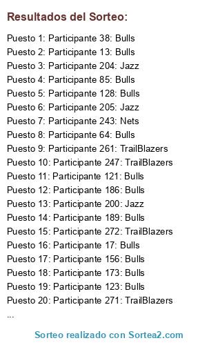 Lista de participantes: Participante 1: Bulls, Participante 2: Bulls, Participante 3: Bulls, Participante 4: Bulls, Participante 5: Bulls, Participante 6: Bulls, Participante 7: Bulls, Participante 8: Bulls, Participante 9: Bulls, Participante 10: Bulls, Participante 11: Bulls, Participante 12: Bulls, Participante 13: Bulls, Participante 14: Bulls, Participante 15: Bulls, Participante 16: Bulls, Participante 17: Bulls, Participante 18: Bulls, Participante 19: Bulls, Participante 20: Bulls, Participante 21: Bulls, Participante 22: Bulls, Participante 23: Bulls, Participante 24: Bulls, Participante 25: Bulls, Participante 26: Bulls, Participante 27: Bulls, Participante 28: Bulls, Participante 29: Bulls, Participante 30: Bulls, Participante 31: Bulls, Participante 32: Bulls, Participante 33: Bulls, Participante 34: Bulls, Participante 35: Bulls, Participante 36: Bulls, Participante 37: Bulls, Participante 38: Bulls, Participante 39: Bulls, Participante 40: Bulls, Participante 41: Bulls, Participante 42: Bulls, Participante 43: Bulls, Participante 44: Bulls, Participante 45: Bulls, Participante 46: Bulls, Participante 47: Bulls, Participante 48: Bulls, Participante 49: Bulls, Participante 50: Bulls, Participante 51: Bulls, Participante 52: Bulls, Participante 53: Bulls, Participante 54: Bulls, Participante 55: Bulls, Participante 56: Bulls, Participante 57: Bulls, Participante 58: Bulls, Participante 59: Bulls, Participante 60: Bulls, Participante 61: Bulls, Participante 62: Bulls, Participante 63: Bulls, Participante 64: Bulls, Participante 65: Bulls, Participante 66: Bulls, Participante 67: Bulls, Participante 68: Bulls, Participante 69: Bulls, Participante 70: Bulls, Participante 71: Bulls, Participante 72: Bulls, Participante 73: Bulls, Participante 74: Bulls, Participante 75: Bulls, Participante 76: Bulls, Participante 77: Bulls, Participante 78: Bulls, Participante 79: Bulls, Participante 80: Bulls, Participante 81: Bulls, Participante 82: Bulls, Participante 83: Bulls, Participante 84: Bulls, Participante 85: Bulls, Participante 86: Bulls, Participante 87: Bulls, Participante 88: Bulls, Participante 89: Bulls, Participante 90: Bulls, Participante 91: Bulls, Participante 92: Bulls, Participante 93: Bulls, Participante 94: Bulls, Participante 95: Bulls, Participante 96: Bulls, Participante 97: Bulls, Participante 98: Bulls, Participante 99: Bulls, Participante 100: Bulls, Participante 101: Bulls, Participante 102: Bulls, Participante 103: Bulls, Participante 104: Bulls, Participante 105: Bulls, Participante 106: Bulls, Participante 107: Bulls, Participante 108: Bulls, Participante 109: Bulls, Participante 110: Bulls, Participante 111: Bulls, Participante 112: Bulls, Participante 113: Bulls, Participante 114: Bulls, Participante 115: Bulls, Participante 116: Bulls, Participante 117: Bulls, Participante 118: Bulls, Participante 119: Bulls, Participante 120: Bulls, Participante 121: Bulls, Participante 122: Bulls, Participante 123: Bulls, Participante 124: Bulls, Participante 125: Bulls, Participante 126: Bulls, Participante 127: Bulls, Participante 128: Bulls, Participante 129: Bulls, Participante 130: Bulls, Participante 131: Bulls, Participante 132: Bulls, Participante 133: Bulls, Participante 134: Bulls, Participante 135: Bulls, Participante 136: Bulls, Participante 137: Bulls, Participante 138: Bulls, Participante 139: Bulls, Participante 140: Bulls, Participante 141: Bulls, Participante 142: Bulls, Participante 143: Bulls, Participante 144: Bulls, Participante 145: Bulls, Participante 146: Bulls, Participante 147: Bulls, Participante 148: Bulls, Participante 149: Bulls, Participante 150: Bulls, Participante 151: Bulls, Participante 152: Bulls, Participante 153: Bulls, Participante 154: Bulls, Participante 155: Bulls, Participante 156: Bulls, Participante 157: Bulls, Participante 158: Bulls, Participante 159: Bulls, Participante 160: Bulls, Participante 161: Bulls, Participante 162: Bulls, Participante 163: Bulls, Participante 164: Bulls, Participante 165: Bulls, Participante 166: Bulls, Participante 167: Bulls, Participante 168: Bulls, Participante 169: Bulls, Participante 170: Bulls, Participante 171: Bulls, Participante 172: Bulls, Participante 173: Bulls, Participante 174: Bulls, Participante 175: Bulls, Participante 176: Bulls, Participante 177: Bulls, Participante 178: Bulls, Participante 179: Bulls, Participante 180: Bulls, Participante 181: Bulls, Participante 182: Bulls, Participante 183: Bulls, Participante 184: Bulls, Participante 185: Bulls, Participante 186: Bulls, Participante 187: Bulls, Participante 188: Bulls, Participante 189: Bulls, Participante 190: Jazz, Participante 191: Jazz, Participante 192: Jazz, Participante 193: Jazz, Participante 194: Jazz, Participante 195: Jazz, Participante 196: Jazz, Participante 197: Jazz, Participante 198: Jazz, Participante 199: Jazz, Participante 200: Jazz, Participante 201: Jazz, Participante 202: Jazz, Participante 203: Jazz, Participante 204: Jazz, Participante 205: Jazz, Participante 206: Jazz, Participante 207: Jazz, Participante 208: Jazz, Participante 209: Jazz, Participante 210: Nets, Participante 211: Nets, Participante 212: Nets, Participante 213: Nets, Participante 214: Nets, Participante 215: Nets, Participante 216: Nets, Participante 217: Nets, Participante 218: Nets, Participante 219: Nets, Participante 220: Nets, Participante 221: Nets, Participante 222: Nets, Participante 223: Nets, Participante 224: Nets, Participante 225: Nets, Participante 226: Nets, Participante 227: Nets, Participante 228: Nets, Participante 229: Nets, Participante 230: Nets, Participante 231: Nets, Participante 232: Nets, Participante 233: Nets, Participante 234: Nets, Participante 235: Nets, Participante 236: Nets, Participante 237: Nets, Participante 238: Nets, Participante 239: Nets, Participante 240: Nets, Participante 241: Nets, Participante 242: Nets, Participante 243: Nets, Participante 244: Nets, Participante 245: Nets, Participante 24