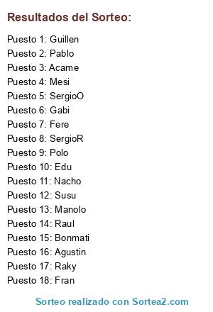 Lista de participantes: Manolo, Bonmati, Susu, Fere, Pablo, Mesi, Nacho, Gabi, SergioR, SergioO, Agustin, Raul, Guillen, Edu, Acame, Polo, Raky, Fran.