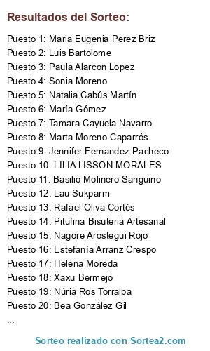 Lista de participantes: Úrsula Ob, Carmen Esteban Arévalo, Eva Palomares Esteban, Arancha Sebastian, Natalia Lorente, Fina Zamora Murillo, Laura Gómez Cobos, Itzi Go, Rosa Jerez, Beatriz Valle Garcia, Maria Tresserras Benedicto, Little Sae, Jose Francisco Guardiola Gonzalez, Laura Gomez Sastre, Rafael Oliva Cortés, Maria Leon, Felicidad Villanueva Rodriguez, Arantxa Sanchez, Tati Barreto, Rosi DA, Pedro Medel Rivero, Alfredo Peralta, Merche Bellido, Sandra Gómez Martínez, Claudia Pavel Pavel, Pilar Jimenez Corrales, María Amparo González Cordón, Javier Pombar Flores, Jasone León Meco, Maria Angeles Bonet Selfa, Laura Gómez, Sorteos Mil, Melisa Camuñas, Inma Cervera, Cazallera Paquemás, Laura Fia, Jennifer de las Mercedes Bassó Sánchez, Vanesa Alba Lopez, Maria Mercè, Rocio Tortosa Domingo, Esther Quiñones, Maria Nuñez, Miriam Lozano, Chari Perez, Raquel Venegas Castellà, Concepción López DEL Castillo, Rosario Acevedo Nuñez, Ana Belen Haro, Olga Garcia Luque, Eduardo Gonzalez Cortes, Melania Filipe Sanchez-gil, Juan Antonio Ayllon Sanchez, Frank Oliver, Myriam Valladolid, Avelina Soto Ventura, Irene Masip Morte, Maria Fernandez, Eva Garcia, Julian Sanz Muñoz, Ely Alonso, Beatriz Valios Gutierrez, Fany Di Natale, Castellanos Caballero Orochimaru, Núria Solé, Carmen M Gon, Gloria Urquidi Fernandez, Toñi Palacio, Aroa Echevarria Perez, Jose Carlos Martin Perdomo, Paky Molina Mesa, Roman Selenkho, Carlos Del Olmo Momblanc, Fely Msan, Mar León, Sonia Gómez Diez, Teresa Tornero Rubio, Tamara Rivas Galindo, Sonia Calderon Muñoz, Teresa Salinas, Nuria Sanz Tornero, Rafael Lopez Ruiz, Félix López Ruiz, Cristina Aparicio Herrero, Liz Medina, Elena Nieto Lorenzo, Paula Alarcon Lopez, Jose ignacio Martinez Gonzalez, Angeles Garcia Portillo, Clara Garcia, David Jabalera, Alazne Etxebarria, Angel Jabalera Garcia, Rosa Rodriguez Ortiz, Tamara Oller, Isabel Casanova, Sheila Rubi, Alejandra González Pérez, Maria Riquelme Rico, Jose María Sanchez, Adela Sendra Montes, Maria Sanchez Dominguez, Saray Rodriguez Gallego, Ana Cortina Diez, José Varo, Giisela Torres, Perla German Cardozo, Maria Eugenia Arias Lozano, Jennifer Fernandez-Pacheco, Florentina Trigo Gonzalez, patricia fraga martinez, Enany Espinosa Serrano, Jose Julian Escudero Sahagún, Elena García, Saúl Pérez Rodríguez, Daniel M R, Jonathan Gomez, Sara del rio carballo, Jose María Pérez Zarco, Mireia Cuella Serres, mireia català, Alberto González, Gema Garate Embid, Fernando Toledo Díaz, Mireia Pamies, María Vanesa González Hermoso, Cristian Alonso Domínguez, July Manco, Sonia Garate Embid, Ana María Gutiérrez, Maria Jose Lopez Velasco, Ivan Monzon Garces, Mar Lopez Velasco, Chelo Martínez López, Susi Sanches Caballero, Jesus Fernandez Romero, María Langarita Garcés, Raquel Martinez Berbel, Laura Medel Vivas, Pitufina Bisuteria Artesanal, Elena Riberas Pérez, Christian Mercader, José Manuel Roncero Granado, Virginia Acevedo, Rocío Márquez Medina, Marta Moreno Caparrós, Antonella Sosa Cheloni, Ana Andrades Sánchez, Mari Cruz Ballester Trigo, Raquel Ballesteros Cortón, Oscar Perez Pou, Maria Belen Lopez Velasco, Inmaculada Huerta Sanchez, Natalia Pérez Sedeño, Susana Cubel Rozalen, Toni AC, Marimar Garcia Urbaneja, Arantza Saez, Yolanda Cubel Rozalen, Loka Esp, Samia Idrissi, Naiara Serrano Rodriguez, Esther Vinagre Borràs, Lenís Toubé Barrera, monica grau seto, Fernando Taroncher Bosch, Jesús Pérez Cámara, Jose Vicente Mascuñán Lidón, Adrian Martinez Barbudo, Ana Teresa Torres Tejero, Cristina Garcia Lozano, Maria Isabel Fernandez, Isa Domínguez, Sara Martin, Jonan Urbieta, Joana Sánchez Romero, Toni ARomero, Vanessa Flores Vicario, Rocio Lopez Dominguez, Antonia Calleja, Sandra Hierro Blanco, Jhony Rguez, Laura Garcia Taboada, Carmen Mula Lagares, Elena Rodríguez Moreno, Corina Diana Radu, Marisa Alejandre Salat, Juani Gonzalez Bachiller, Raquel Alcalde Vedri, Jorge David Conde Miguélez, Cristina Palanca, Fernando Taroncher Ballester, Ángela Román Almazán, Mari Jose Angulo, Miriam Hidalgo, Anna Bon, Antonio Gayubo Nebreda, Susanna Corral, Helen Madrid, Laia Bic, Laura Sanz, Eva Cuadrado, Angela NC, Muntsa Boix, Lau Sukparm, Nico Gatoo, Marta Gil, Maria Jose Peña Adame, Sandra Gonzalez Garrido, Sonia Gonzalez Garrido, Susanna Lopez, Monica Tgn, Maria Garcia, Mar Fdz, Lucas LM, Puri Sanchez, Marta Montenegro, Clara Sole, Javier García Fernández, Montse GeTa, Salva Basi, Nuria Riu, Yolanda Galea, Cecilia Iglesias Del Valle, estela alfonso, Rocio Martin Martinez, Nica Vero Vero, Cristina Mayol Bermejo, Marian Bogdan Stefan, Vanesa Calvo Chao, Daniel Perez Val, Cristina Fernández, Maria Rivas Ibáñez, Elena Rudiez, María Pilar Cascant Salvador, Jessica Vilella Gonzálvez, Sara de la Hoz moyano, Susana Grande Hernández, Yolanda Garcia, Eva Fernandez, Alba Serrambo, Veronica Costas, Carolina Campos Garcia, Josefa Álvarez F, Elo Minguez, Leonor Mendoza, Míguel Angel Caballero, Noe Applewhite (Noemi Glez Silva), Nagore Arostegui Rojo, Zulema Pontes Vidal, Maria Victoria Martos Sanchez, Janire Lucha, M Gracia Jimenez, Merche Gallardo Leon, Helena Yolanda Loeb Ferre, José Tordera Illescas, María López Iglesias, Carolina del Olmo Guijarro, Alicia Palmer León, Marisa Gonzalez, Tamara Boza Jimenez, Georgina Estany Galofré, Vânia Vieira, Marifloysuspotis Rosales, NagoAsi Barrilonso, Marta Glez, Belen Padial, Conchi Caballero López, Maite Sevilla del Pozo, Monica Marin Gonzalez, Lucia Astuy Velasco, Jose Sanchez Garcia, Esther Molina Priego, Eva María Reyes García, Elena Fernandez Lopez, Nieves Polo, Maria Sepulveda, Ester Laorden, Antonio Alarcon, Cristina Puebla Fernandez, Irene Good, Sophia Sanchez Peña, Tini Marrini Flechini, José Antonio Fenollosa Abellan, Virginia González Acebal, Livia Slivia, Alejandro Gomes Bello, Ana Martin, María José Arana, Míriam Martín, Elisa Sancho Sánchez, Alejandra Lobelle, Mavi Ares Fernandez, Encarnacion Gullon Arias, Estefan