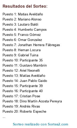 Lista de participantes: Jonathan Herrera Fábregas, Gustavo Mambrin, Lautaro Baldi, Víctor Robles, Tomas Suárez, Omar Gonzalez, Gabriel Tuina, Sergio Florentín, Juan Pablo Gaido, Fede Ibáñez, Marcos Quiroga, Leandro Guzmán, Andrés Rivas, Leandro Pablo Cabrera, Matías Aveldaño, Juan Romero, Cristian Riquelme, Martín Juárez, Roberto Espeche, Dino Martín Acosta Pereyra, Lucas Matías Torcivia, Mariano Alonso, Franco Gómez, Nico DM, Leandro Riquelme, Hernan Locura, Matías Pérez, Martín Garay, Humberto Campos, Jonathan Ortigoza, Rodrigo Llerena, Cristian Pose, Ariel Neonelli, Matias Aveldaño, Participante 35, Participante 36, Participante 37, Participante 38, Participante 39, Participante 40.