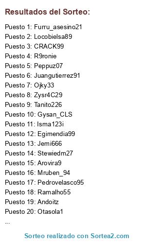 Lista de participantes: Mruben_94, Eliaasfernandez, Gysan_CLS, RonMatusalem13, Ramalho55, IvaanM95, Borjarember, Pedrovelasco95, Tanito226, BorjaRT13, Iraitzpitxu, Byronmixeleroney, Sevemumo, Pelito10, Jemi666, Pelizelli, Arovira9, Egimendia99, Zysr4C29, Pabloggv, R9ronie, Peppuz07, Stewiedm27, CRACK99, Facio7, Sacisto, Furru_asesino21, Fer_man-87, Spain_Kiko, Otasola1, Sersol13, Assasinstoto, Locobielsa89, Aronsito86, Ojky33, Yeraiguiu2311, Juangutierrez91, Andoitz, Isma123i, J_murcia.
