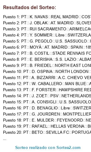 Lista de participantes: PT F. FORSTER HAMPSHIRE RED ENGLAND 201 76 26 80, PT W. CABALLERO MAN BLUE ARGENTINA 186 80 33 80, PT BETO SEVILLA FC PORTUGAL 182 81 32 80, PT D. BENAGLIO Libre SWITZERLAND 194 89 31 80, PT HELTON FC PORTO BRAZIL 189 80 36 80, PT Y. SOMMER Libre SWITZERLAND 183 80 25 80, PT G. OCHOA MÁLAGA CF MEXICO 185 78 29 80, PT M. VORM NORTH EAST LONDON NETHERLANDS 182 86 30 80, PT B. COSTIL STADE RENNAIS FC FRANCE 187 83 27 80, PT C. ABBIATI A.C. MILAN ITALY 191 92 37 79, PT TEN ROUWELAAR NAC BREDA NETHERLANDS 187 88 33 79, PT J. ZOET PSV NETHERLANDS 189 85 23 79, PT E. MULDER FEYENOORD NETHERLANDS 193 88 25 79, PT J. OBLAK AT. MADRID SLOVENIA 186 77 21 79, PT RUI PATRÍCIO SPORTING PORTUGAL 190 85 26 79, PT MOYÀ AT. MADRID SPAIN 189 82 30 79, PT A. BORUC, PT K. NAVAS REAL MADRID COSTA RICA 184 78 27 79, PT NETO ACF FIORENTINA BRAZIL 191 83 25 79, PT I. AKINFEEV PFC CSKA MOSKVA RUSSIA 186 78 28 79, PT ROBERTO OLYMPIACOS FC SPAIN 192 76 28 79, PT DIEGO CAVALIERI Libre BRAZIL 191 86 31 79, PT B. FRIEDEL NORTH EAST LONDON UNITED STATES 191 92 43 78, PT M. AGAZZI A.C. MILAN ITALY 189 85 30 78, PT CÁSSIO, PT J. RUDDY NORFOLK CITY ENGLAND 193 96 27 78, PT G. JOURDREN MONTPELLIER HÉRAULT SC FRANCE 181 82 28 78, PT E. VIVIANO U.C. SAMPDORIA ITALY 195 91 28 78, PT A. BIZZARRI A.C. CHIEVO VERONA ARGENTINA 188 82 36 78, PT A. CONSIGLI U.S. SASSUOLO ITALY 189 79 27 78, PT D. OSPINA NORTH LONDON COLOMBIA 183 79 26 77, PT E. BERISHA S.S. LAZIO ALBANIA 194 92 25 77, PT B. JONES MERSEYSIDE RED AUSTRALIA 191 76 32 77, PT RAFAEL HELLAS VERONA BRAZIL 187 80 32 77, PT G. PEGOLO U.S. SASSUOLO ITALY 183 76 33 77, PT RUI SACRAMENTO ARIMELCAO PORTUGAL.