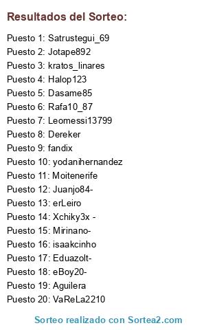 Lista de participantes: Oskis, Ruben, Churro, Jony, Carlos_rs, Carliosliorah, Iral, Caborras, Ciber, Benze, Toni, Ivan, Raulaco, Pipi, Kati, Alf, Fido, Amogu, Montiguillena, Roberto, Revilluka, Potichero, Paul, Anto-Mora.