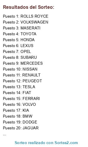 Lista de participantes: AUDI, BMW, CITROEN, DODGE, FERRARI, FIAT, HONDA, INFINITI, JAGUAR, KIA, LEXUS, MASERATI, MERCEDES, NISSAN, OPEL, RENAULT, ROLLS ROYCE, SEAT, SUBARU, TESLA, TOYOTA, VOLVO, VOLKSWAGEN, PEUGEOT.