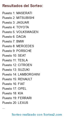 Lista de participantes: AUDI, BMW, CITROEN, DACIA, FERRARI, FIAT, FORD, HONDA, INFINITI, JAGUAR, KIA, LAMBORGHINI, LEXUS, MASERATI, MAZDA, MERCEDES, MITSUBISHI, NISSAN, OPEL, PEUGEOT, PORSCHE, RENAULT, SEAT, SKODA, SUBARU, SUZUKI, TESLA, TOYOTA, VOLKSWAGEN, VOLVO.