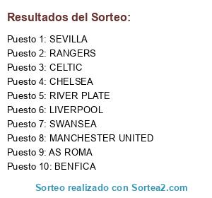 Lista de participantes: CELTIC, AS ROMA, SEVILLA, CHELSEA, BENFICA, LIVERPOOL, SWANSEA, RIVER PLATE, RANGERS, MANCHESTER UNITED.