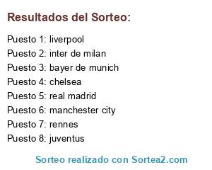 Lista de participantes: rennes, real madrid, bayer de munich, chelsea, liverpool, juventus, inter de milan, manchester city.