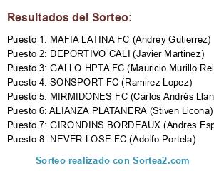 Lista de participantes: MIRMIDONES FC (Carlos Andrés Llanos Arrieta), SONSPORT FC (Ramirez Lopez), ALIANZA PLATANERA (Stiven Licona), GIRONDINS BORDEAUX (Andres Espitia), MAFIA LATINA FC (Andrey Gutierrez), GALLO HPTA FC (Mauricio Murillo Reina), NEVER LOSE FC (Adolfo Portela), DEPORTIVO CALI (Javier Martinez).