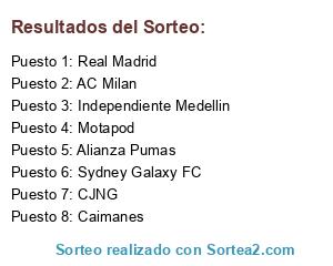 Lista de participantes: Independiente Medellin, CJNG, Alianza Pumas, Sydney Galaxy FC, Real Madrid, Motapod, Caimanes, AC Milan.