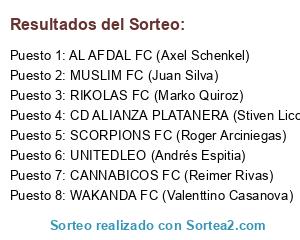 Lista de participantes: RIKOLAS FC (Marko Quiroz), CD ALIANZA PLATANERA (Stiven Licona JR.), CANNABICOS FC (Reimer Rivas), UNITEDLEO (Andrés Espitia), SCORPIONS FC (Roger Arciniegas), MUSLIM FC (Juan Silva), AL AFDAL FC (Axel Schenkel), WAKANDA FC (Valenttino Casanova).