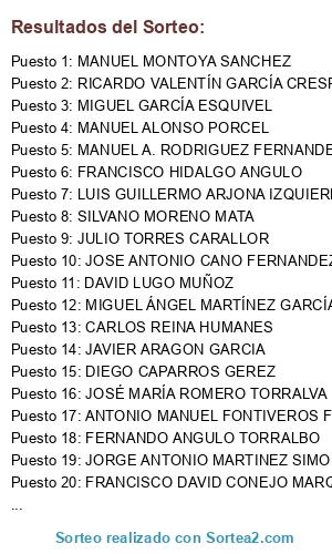 Lista de participantes: ANDRES GARCIA FLORES, ANGEL SANCHEZ PADILLA, CARLOS SEBASTIAN ROS, CARMELO TORRES GARCIA, DIEGO CAPARROS GEREZ, FRANCISCO PALENZUELA BAENA, FRANCISCO VALDIVIA BAYO, FRANCISCO ZURITA SANCHEZ, GERMAN ARQUEROS RODRIGUEZ, GINES J FERNANDEZ PEREZ, IGNACIO FERNANDEZ VERA, JESUS LARA CRESPO LOPEZ, JESUS PEREZ DE PEREZ DIAZ, JORGE ANTONIO MARTINEZ SIMON, JOSE ANTONIO GARCIA OCON, JOSE MARIA MARTINEZ MALDONADO, JUAN AMATE FRANCO, JULIO TORRES CARALLOR, LUZ MARIA FERNADEZAGUILERA, MANUEL ALONSO PORCEL, MANUEL MONTOYA SANCHEZ, MARI CARMEN CORTES SANCHEZ, MARIA LUISA CIRUGEDA MONTOJO, MARIA LUISA HURTADO LOPEZ, MARIANO FERNANDEZ MARIN, MIGUEL ANGEL DOMINGEZ VELAZQUEZ DE CASTRO, MIGUEL BELTRAN LOPEZ, PEDRO LOPEZ FERNANDEZ, PEDRO NAVARRO FERNANDEZ, RAMON GARCIA ORTEGA, RAUL CAÑADAS NAVARRO, ROBERTO SALOMAO ORTEGA, SALVADOR VALVERDE LINARES, SIMON HARO RUBIO, ALVARO MUÑOZ MAESTRE, ANA BORRAJEROS GALLEGO, ANGEL MARQUEZ HORRILLO, EDUARDO ORTEGA GONZALEZ DEL VAL, FRANCISCO JAVIER VERDÚ BAEZA, FRANCISCO RODRÍGUEZ HEVIA, IGNACIO CASTRILLÓN FERNÁNDEZ, JAVIER ARAGON GARCIA, JOSE FERNANDO GARCIA-TREVIJ. FERNANDEZ, JOSE LUIS CUEVAS GARCIA, JOSE MARIA OTERO-SAAVEDRA, JOSE MIGUEL SANTIAGO COSSI, JUAN CARLOS ARANDA ARENILLAS, LAURA SÁNCHEZ MUÑOZ, Mª DE LOS SANTOS GONZALEZ VIRUEZ, MANUEL PEREZ MARIN, MIGUEL ANGEL GOMEZ HINOJO, PEDRO JOSE MADRID TRUJILLO, PEDRO LUIS COLLADO TOLEDO, RAFAEL GOMEZ CABRERA, RAFAEL LOPEZ ALVAREZ, RAFAEL MARTINEZ DEL VALLE, ALICIA MORENO CASTRO, ANTONIO PÉREZ, CARLOS JAÉN TOSCANO, CARLOS JESÚS CORRAL BAENA, CARLOS MARIN BELLIDO, CATALINA POZUELO TORRALBO, CRISTOBAL MARTIN AGUILERA, EMILIO NAVARRO, EUSEBIO SALAMANCA, FERNANDO ANGULO TORRALBO, FRANCISCO JOSÉ NAVARRO ESQUINAS, GREGORIO OCAÑA AGUILERA, JESUS EVARISTO PEREZ NARVAEZ, JOAQUÍN FERNÁNDEZ CARRILLO, JOSE ANTONIO RUIZ SÁNCHEZ, JUAN HIDALGO GOMEZ, MANUEL GARCIA MEDINA, MARÍA INMACULADA JIMÉNEZ HITA, MIGUEL CADENAS DE LLANO SOSA, RAFAEL GARCÍA PRIETO, ADELA DEL ROSARIO NAVARRO GARCIA, ALEJANDRO JOSE SAN MARTIN DIAZ, ANTONIO JAVIER SANCHEZ MARTIN, ANTONIO JOSE MACHUCA PERIÑAN, ANTONIO LOPEZ MALDONADO, ANTONIO MANUEL AGUILAR MEGIAS, ANTONIO SANTIAGO ORTEGA, BEATRIZ GUZMAN DOIZTUA, CHRISTIAN ENRIQUE DE SEVERAC CANO, DAVID NAVARRO CAPILLA, EMILIO GARCIA VILLALTA, EMILIO PEREZ JIMENEZ, FABIOLA MORENO MEDINILLA, FRANCISCO JOSE MORALES ROMERO, FRANCISCO MIGUEL JIMENEZ SUAREZ, IGNACIO MAS MONTERO, ISABEL EGEA FLORES, ISIDRO MOLEON PAIZ, JESUS DOMINGUEZ GARCIA, JESUS MIGUEL JIMENEZ ESCAMILLA, JORGE CRIADO PEREZ, JOSE ANTONIO CANO FERNANDEZ, JOSE LUIS MARISCAL VICENTE, JOSE MARIA SANCHEZ ORTIZ, JOSE MIGUEL JIMENEZ DIAZ, JOSE RODRIGUEZ VARGAS, JOSE ROMERO MALLORQUIN, JUAN DE DIOS LARIOS LOPEZ, JUAN RAMÓN MEDINA POLO, LEONARDO CESAR GUARDIA GARCIA, LORENZO SOLANO GARCIA, LUIS GUILLERMO ARJONA IZQUIERDO, MAGDALENA LORCA GARCIA, MANUEL JESUS MIRA MARTIN, MANUEL MARTINEZ MADRID, MARCOS CULEBRAS PALAO, MARIA AUXILIADORA SANCHEZ CASTRO, MARIA DOLORES GIMENEZ FERNANDEZ, MARIA JOSE ARROYO GUERRERO, MARIA JOSE GRANIZO DIAZ, MARIA TERESA FLORES VILAR, MARIA TRINIDAD LAGUNA HARO, MARIÁNGELES RUIZ JIMÉNEZ, MARTIN JESUS LOPEZ CORRAL, MIGUEL ANGEL MOLES QUITIAN, MONICA MORENO SOTO, PABLO LUIS MARIN GALLARDO, PALOMA GARCIA MOLINA, PAULINO V. BAENA LOPEZ, PEDRO JOSE DE LA O GARCIA, RAFAEL GIRON FERNANDEZ CRE., DAVID MARTINEZ POZO, FRANCISCO JAVIER PIOSA CRUZADO, FRANCISCO JOSE RUFINO DURAN, FRANCISCO RICO RODRIGUEZ, JOSE GOMEZ DOMINGUEZ, JOSE JULIAN PAMPANO GARCIA, JUAN MANUEL RODRIGUEZ MURIEL, MARIA DEL MAR ROJANO GARCIA, RAFAEL PICHEL CHAPARRO, SIMON GUERRA RODRIGUEZ, ENCARNACION CORTES PRIETO, FRANCISCO JAVIER FERNANDEZ DONCEL, JUAN MORAL ORTEGA, MIGUEL ANGEL GONZALEZ CARMONA, RAMON GARCIA MATEO, ALVARO FDEZ DE LIENCRES AGUILO, ANA MARIA TORCUATO TRIGUERO, ANTONIO FCO. GEA MUÑOZ, ANTONIO FERNANDEZ FORNIELES, ANTONIO MANUEL FONTIVEROS FERNANDEZ, ANTONIO NARANJO SANCHEZ, ANTONIO P. GARCIA ARENAS, APOLINAR FERNANDEZ GONZALEZ, CARLOS LAMAS FERNANDEZ, CARLOS RODRIGUEZ LAGO, ENRIQUE AGUILAR VEGA, FERNANDO DIAZ ESCOBAR, FRANCISCO DAVID CONEJO MARQUEZ, FRANCISCO JAVIER ARCAS PEREZ, FRANCISCO JAVIER CALVO CAZALLA, FRANCISCO JAVIER ORTIZ ESTACIO, FRANCISCO JAVIER RUIZ MARIN, FRANCISCO PEREZ SERRANO, JESUS CABRERA LOPEZ, JESUS JOSE RODRIGUEZ SERRANO, JOAQUIN PEREZ BELLIDO, JORGE MACIAS MORENO, JOSE ANTONIO CONDE HEREDIA, JOSE CARLOS CASABLANCA GARCIA, JOSE CHICON JIMENEZ, JOSE LUIS ALFONZO LEON, JOSE MARCOS TRUJILLO MORENO, JOSE MARIA PAREDES SANTOS, JUAN ANTONIO PEREZ FERNANDEZ, JUAN DOMINGO RUIZ DE MIER, JUAN JAVIER OSUNA MORAL, JUAN JOSE TRUJILLO CEBRIAN, LIDIA MARIA GARCIA MALENO, LORENZO JOSE FUENTES HIDALGO, LUIS ALFONSO MARTIN DELGADO, LUIS CASTILLA ESTEVEZ, MANUEL A. RODRIGUEZ FERNANDEZ, MANUEL ROMERO TORRES, MARIA DEL MAR SOLIS MARTIN, MARIA ISABEL HERROJO MILLAN, MARIANO LUQUE PANCORBO, MOHAMED TOUFIK DIOURI YELUL, OLGA PEREZ ZAFRA, PABLO ESCASSI OLIVARES, PABLO RAFAEL PASTOR VEGA, RAFAEL REYES MORENO, RAFAEL SALCEDO SALAZAR, RICARDO JIMENEZ MARTIN, RICARDO PASCUA MANZANO, ROCIO LARA BUENO, ROSANA VALENZUELA CASTILLO, SILVERIO DIAZ SALADO, SILVIA LOPEZ MALDONADO, VICENTE ALGABA HERRERO, VICENTE PABLO GONZALO MARIN, YOLANDA TRUJILLO DOMINGUEZ, ADRIÁN RASERO BRUZÓN, ALBERTO BERNABÉU, ALICIA PÉREZ, ALVARO DE FUENTES RUIZ, ANTONIO ALFONSO CASAS SANCHEZ, ANTONIO BARRAGAN CASTAÑO, ANTONIO GARCÍA CANO, ANTONIO RODRIGUEZ CUBEROS, AZAHARA LOPEZ CESPEDOSA, BELLA ORTEGA PEREZ, CARLOS GUSTAVO ÁVILA LÓPEZ, CARLOS ISOTTA SANCHEZ, CARLOS ITURRATE ARESTE, CARLOS REINA HUMANES, CARMEN JOSE BELTRAN MAQUEDA, CÉSAR VAQUERO VICENTE, CRISTOBAL SOTILLO MONTAÑO, DARIO ROMERO MORA, DAVID CARO CARO, DAVID GARVÍA LÉRIDA, DAVID GUISADO GARCÍA, DAVID LUGO MUÑOZ, DIEGO VÁZQUEZ RODRÍGUEZ, DIONISIO MOREJON RUIZ, DOMINGO MUÑOZ GONZALEZ, DOMINGO POZO MORÓN, ELIAS BEGINES CABALLERO, ENRIQUE CASADO RODRÍGUEZ, ENRIQUE LACAVE VILLADIEGO, ENRIQUE TRIGOS MANZANO, FCO JAVIER LOPEZ MUÑOZ, FCO. JAVIER LLAGAS GARCÍA, FELIPE MARINA CAS