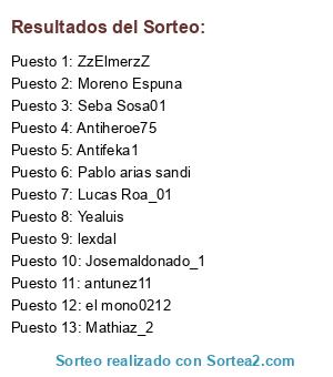 Lista de participantes: Antifeka1, Pablo arias sandi, Seba Sosa01, Yealuis, antunez11, Antiheroe75, Mathiaz_2, Moreno Espuna, Lucas Roa_01, Josemaldonado_1, lexdal, ZzElmerzZ, el mono0212.
