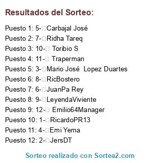 Lista de participantes: 1- RicardoPR13, 2- JersDT, 3- Mario José Lopez Duartes, 4- Emi Yema, 5- Carbajal José, 6- JuanPa Rey, 7- Ridha Tareq, 8- RicBostero, 9- LeyendaViviente, 10- Toribio S, 11- Traperman, 12- Emilio64Manager.