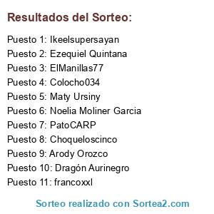 Lista de participantes: Ikeelsupersayan, Arody Orozco, Ezequiel Quintana, Noelia Moliner Garcia, Choqueloscinco, Colocho034, francoxxl, Dragón Aurinegro, Maty Ursiny, ElManillas77, PatoCARP.