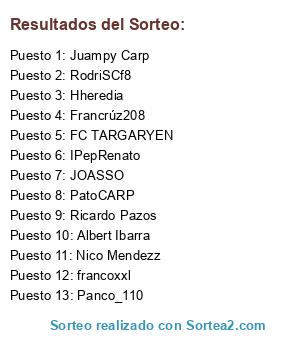 Lista de participantes: PatoCARP, Ricardo Pazos, FC TARGARYEN, RodriSCf8, francoxxl, Albert Ibarra, Panco_110, Hheredia, JOASSO, Nico Mendezz, Francrúz208, Juampy Carp, IPepRenato.
