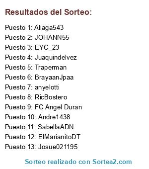 Lista de participantes: FC Angel Duran, RicBostero, anyelotti, EYC_23, JOHANN55, Traperman, Josue021195, SabellaADN, Juaquindelvez, Aliaga543, Andre1438, BrayaanJpaa, ElMarianitoDT.