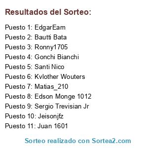 Lista de participantes: Bautti Bata, Matias_210, Kvlother Wouters, Sergio Trevisian Jr, EdgarEam, Gonchi Bianchi, Juan 1601, Jeisonjfz, Edson Monge 1012, Santi Nico, Ronny1705.