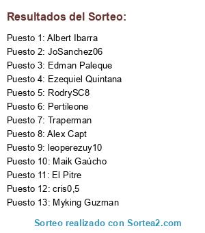 Lista de participantes: leoperezuy10, cris0,5, Pertileone, RodrySC8, Albert Ibarra, Myking Guzman, JoSanchez06, Alex Capt, Traperman, Maik Gaúcho, Ezequiel Quintana, El Pitre, Edman Paleque.