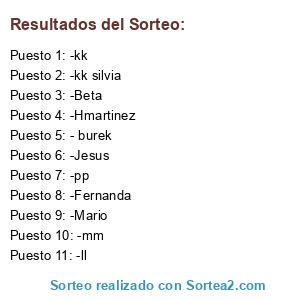 Lista de participantes: -Mario, -Jesus, -Beta, -Dosxuno, -Fernanda, -Hmartinez, -kk silvia, - burek, -ll, -pp, -uu, -kk, -mm, -ww, -vv.