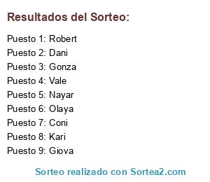Lista de participantes: Kari, Coni, Dani, Giova, Gonza, Nayar, Olaya, Robert, Vale.