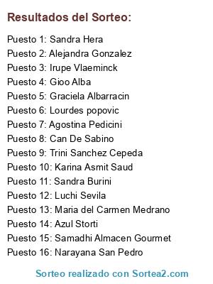 Lista de participantes: Sandra Hera, Graciela Albarracin, Can De Sabino, Sandra Burini, Alejandra Gonzalez, Samadhi Almacen Gourmet, Maria del Carmen Medrano, Karina Asmit Saud, Trini Sanchez Cepeda, Irupe Vlaeminck, Narayana San Pedro, Luchi Sevila, Azul Storti, Gioo Alba, Agostina Pedicini, Lourdes popovic.
