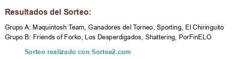 Lista de participantes: Sporting, Friends of Forko, PorFinELO, El Chiringuito, Los Desperdigados, Ganadores del Torneo, Shattering, Maquintosh Team.