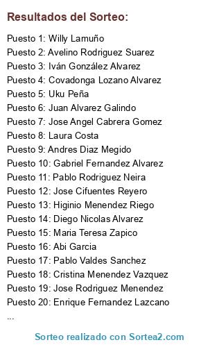 Lista de participantes: Abi Garcia, Sergio Valledor, Diego Nicolas Alvarez, Covadonga Lozano Alvarez, Jose Angel Cabrera Gomez, Andres Diaz Megido, Juan Ignacio Hevia Iglesias, Maria Teresa Zapico, Cristina Menendez Vazquez, Jose Rodriguez Menendez, Willy Lamuño, Enrique Fernandez Lazcano, Javier Fernandez Martinez, Juan Alvarez Galindo, Manuel Jesus Martin Rubio, Jose Manuel Artime Vega, Avelino Rodriguez Suarez, Laura Costa, Jose Cifuentes Reyero, Pablo Rodriguez Neira, Keith Thompson, Ramon Gutierrez García, Carlos Fernando Moran Marugan, Cristina Sánchez Suárez, Uku Peña, Raul Nicolas Mendez, Rebeca Delgado, Gabriel Fernandez Alvarez, Pablo Valdes Sanchez, Iván González Alvarez, Jose Luis Centeno Marquez, Higinio Menendez Riego, Rocio Murru Murru, Maribel Feito, María LS.