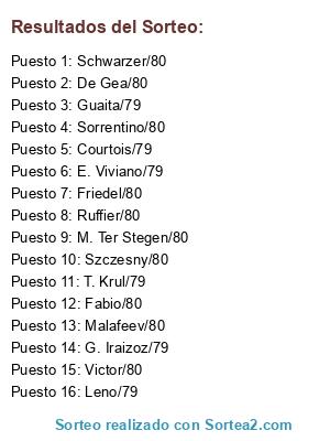 Lista de participantes: Leno/79, Courtois/79, Guaita/79, T. Krul/79, E. Viviano/79, G. Iraizoz/79, De Gea/80, M. Ter Stegen/80, Szczesny/80, Ruffier/80, Malafeev/80, Sorrentino/80, Friedel/80, Schwarzer/80, Victor/80, Fabio/80.
